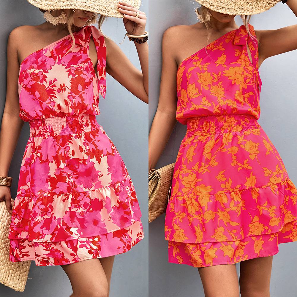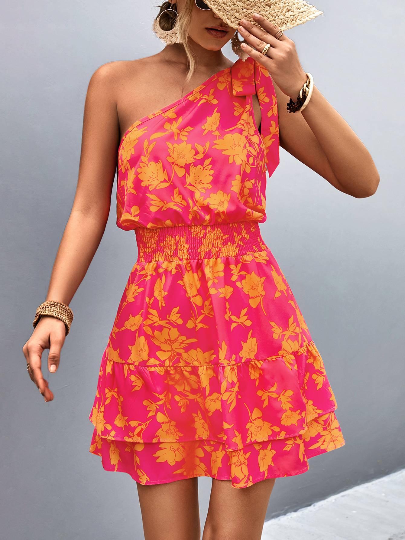 - One Shoulder Printed Ruffle Hem Mini Dress